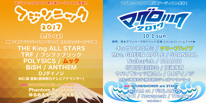 9月30日(土)・10月1日(日)に静岡・清水マリンパーク内イベント広場にて開催される<フジソニック2017>と<マグロック2017>の第五弾アーティストが発表された。