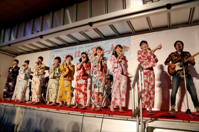 ふわふわはJR羽村駅前の特設ステージで行われた羽村市出身の男性5人組メロディラップバンド、LIFriendsのライブ内に浴衣姿で登場。新曲「恋花火」を、LIFriendsのバンド演奏にあわせて歌唱した。