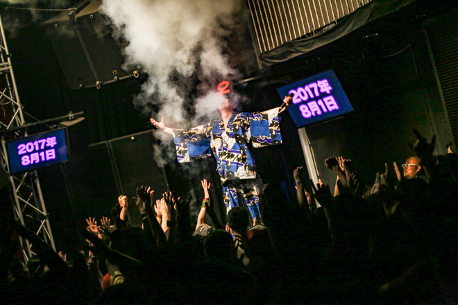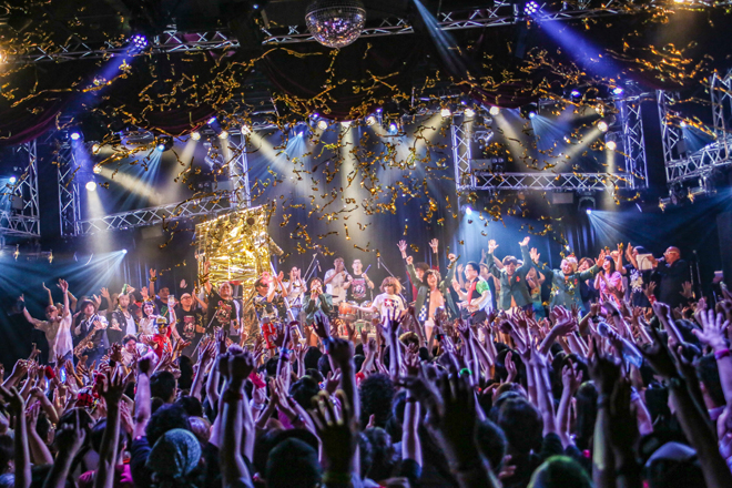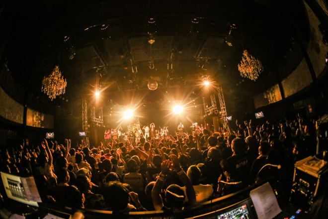 1年8ヶ月ぶりの貴重なライブとなった巨乳まんだら王国。は、強烈な個性を放つ13人の構成員が集結。事前に配られた赤い国旗がフロアを埋め尽くす中、観客は旗を振りながら「国歌斉唱」を大合唱。「ちん毛02」、「肛門」とアッパーなパーティーチューンが続き、観客が掛け声や振り付けを合わせると、会場中に妙な一体感が生まれる。ダンスや掛け声で楽しく賑やかにステージを盛り上げる構成員や、楽曲とリンクした映像も効果的に使われた、エンタテイメント性の高いステージに、初めて見るであろう観客もステージに釘付けになり、「ホルスタイン」、「割礼カレー」といった人気曲では、フロアに大きな渦が生まれる。ラスト「69 ~six nine~」では会場中が「69!」の掛け声を合わせる中、全身網タイツ姿の教祖(Vo&Electro)がフロアにダイブ。必死でサーフする教祖の姿に、大きな笑い声と歓声、そして女子の悲鳴が上がっていた。