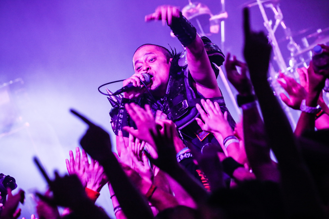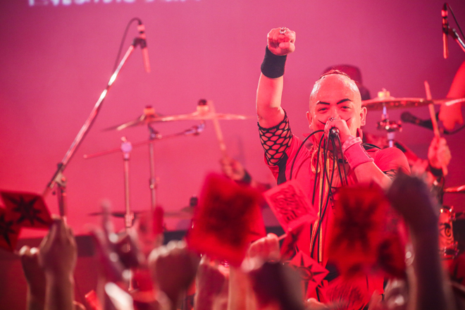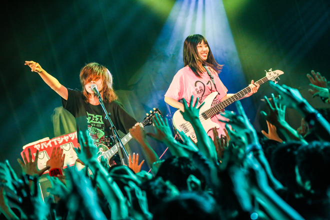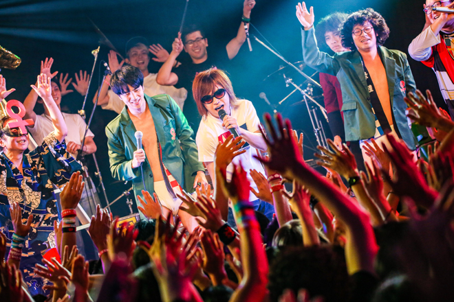揃いの新生姜のかぶり物で登場した打首獄門同好会は、新生姜によく合う“日本の米”を賞賛した「日本の米は世界一」のヘヴィでキャッチーな歌と演奏でライブスタート。大澤敦史(Gt&Vo)が「続いて、「糖質制限ダイエットやってみた」です」と曲紹介すると、河本あす香(Dr)から「米食べないんかい!」とツッコミが入り、笑いが起きる。「“おもしろ”って基本、関西の人を指す言葉だから! 俺たち以外、全員関西で、草サッカーチームが一流リーグに放り込まれた感じ」とプレッシャーを語りながら、会場中がせせりコールを合わせた「ヤキトリズム」、フロアにマグロの浮き輪が舞った「島国DNA」と小道具も駆使して盛り上げ、ラストは曲中、「ステージに立つ者として、何が幸せか? それは面白いと言ってもらえること。笑い疲れるほど、楽しませてやるぜ」と語り、幸せを歌った「フローネル」で会場を幸福感に包んだ。
