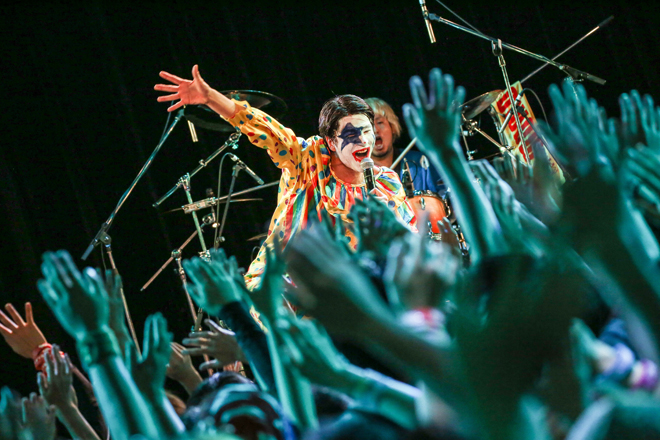 楽器隊のダンスで始まった四星球は、北島康雄(Vo)がおもしろバンドの大先輩である、ニューロティカのあっちゃんを模したピエロ姿で登場。「先輩の言葉を借りると「やりたいことをやらなきゃ嘘になっちまうぜ」ってことで」と、「運動会やりたい」でライブがスタート。「日本一おもろいの称号、どうしても欲しいです。今年は僕たちに下さい! そしたら色んな所で自慢して、ライブハウスをもっとおもろくしますから」と優勝への意欲を語ると、「クラーク博士と僕」、「Mr.Cosmo」の観客を巻き込んでの演出や大合唱で、ライブハウスを使って思い切り遊び、お客さんの盛り上がりも最高潮。ラストは巨まんや花団といった同じ時代を戦ってきた共演者たちへの想いを語り、たっぷり気持ちを込めて「明日まで km」を熱演。温かい空気のまま終了かと思いきや、最後はまさやんが客席に降りて、頭ですいか割りを披露。会場を笑いに包んだ。