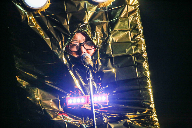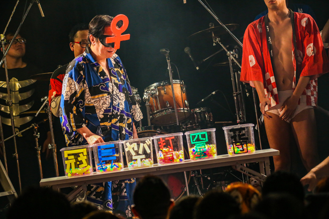 イベントのラストを飾ったのは花団。ライブ前日、事故に遭ったカズ(Vo)が、メンバーの手によって“おもしろロボ”に改造されるというコント映像で始まり、幕が開くとステージの上には5メートルはある、金色のカズロボが登場! ダンボール製のハリボテが脚立に貼り付けられているようにも見えるカズロボが器用に両手を上げて、バンザイの振り付けをしながら「先輩はところてん」を歌い始める。しかし、さほどウケていない客席に業を煮やし、ロボから降りて来てしまうカズ。ロボット風の衣装で再び歌い始め、「最初からこれで良かったやん!」とメンバーにツッコむ。その後、「ラーメンチョップ」、「俺のブーメラン」とライブ鉄板曲で会場を沸かせるが、ガンちゃん(Gt)が突然、尾崎豊「15の夜」を歌い始めたところから様子がおかしくなる。