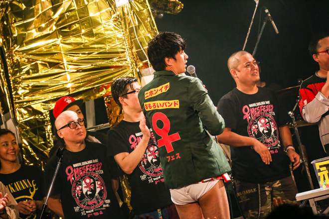 観客と主催の♀田氏が1番目と2番目に面白かったバンドに“超面白玉(ちょーおもしろだま)”を投票し、その投票数で日本一おもろいバンドを決める投票タイムがスタート。観客が自分のバンドに票を入れていく様を目の前で見せられるという、バンドにとってはかなり酷なこの時間。一喜一憂するバンドマンたちを見て、♀田氏は「これ、面白いなぁ!」と大喜び。投票の結果、日本一おもろいバンドに選ばれたのは四星球! ♀田氏から日本一おもろいバンドの証である、♀フェス特製のジャケットを授与され、「ほんま、嬉しいすわ!」と大喜びする四星球。「今日は本当に面白かったです! 好きなバンドしか出ないイベントって、いいよ。また遊ぼうぜ!」 と♀田氏が♀フェスを締めくくる。