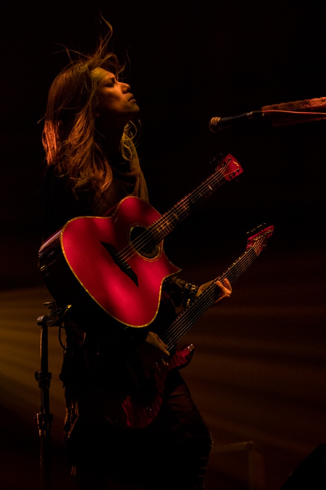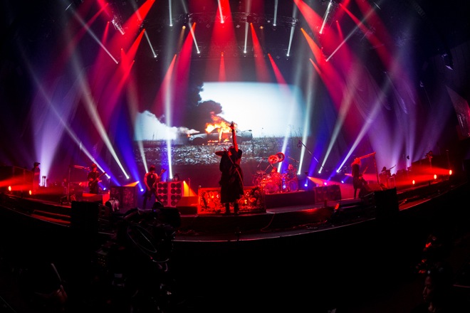 観衆の興味は1曲目に何が演奏されるかに集中していたはずだが、そこでまず炸裂したのは、「Revelation of mankind」。現時点での最新オリジナル・アルバムにあたる『ARCHE』(2014年)からのセレクトだ。激しくも終末感の漂うこの殺伐チューンは、現在のこのバンドを象徴する楽曲のひとつ。同時にそれは、かつてのDIR EN GREYしか知らない人たちにとっては未知の楽曲ということになるだろうし、即座にすべての観客をひとつに束ね得るものではない。が、そうした曲を最初に披露したところに、無言のメッセージが込められているように僕には思えた。敢えて言うなら“これはノスタルジックな想いに浸るための場ではない”というような。