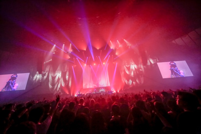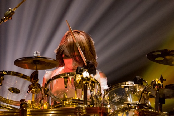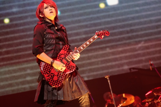 そして、いきなり時計を逆回転させるようにして次なる「audience KILLER LOOP」(2003年発表の『VULGAR』に収録)が披露され、ステージ左右に設えられたスクリーンに、この曲を歌う京の姿とともに歌詩の一部が映し出された時、“箱庭”という言葉がやけに鮮烈に目と耳に飛び込んできた。箱庭という、閉ざされた楽園。彼らはこの巨大アリーナをそれに見立てているのではないか、と感じさせられたのだ。