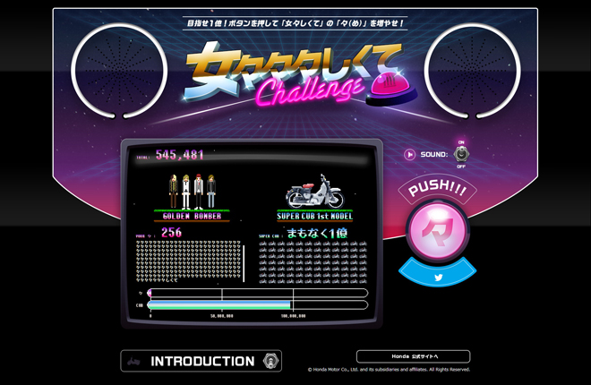 このコンテンツは、Honda原付二輪のイメージキャラクターを務めるゴールデンボンバーが、世界生産累計台数1億台を迎える「スーパーカブシリーズ」に挑むために開発されたもの。サイト上のボタンを押すと「女々しくて」の「々(め)」と、ランダムで「女々しくて辛いよ〜」と音が鳴る仕様だ。