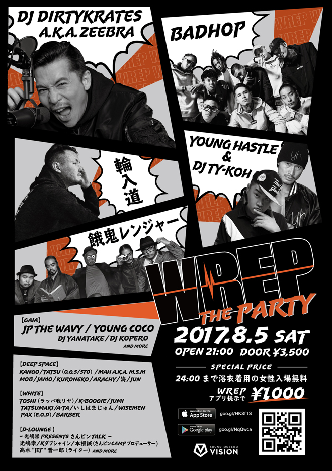 本日5日(土)SOUND MUSEUM VISIONでZeebraが局長を務める、ヒップホップ専門ラジオ局“WREP”のパーティ<WREP the Party>が開催される。<WREP the Party>は、今年4月に開局した日本初のヒップホップ専門、24時間インターネットラジオ局“WREP”が主催するパーティ。この日はDJ DIRTYKRATESことZeebraがホストを務め、餓鬼レンジャー、JP THE WAVY、YOUNG COCOらがパフォーマンスを行う。