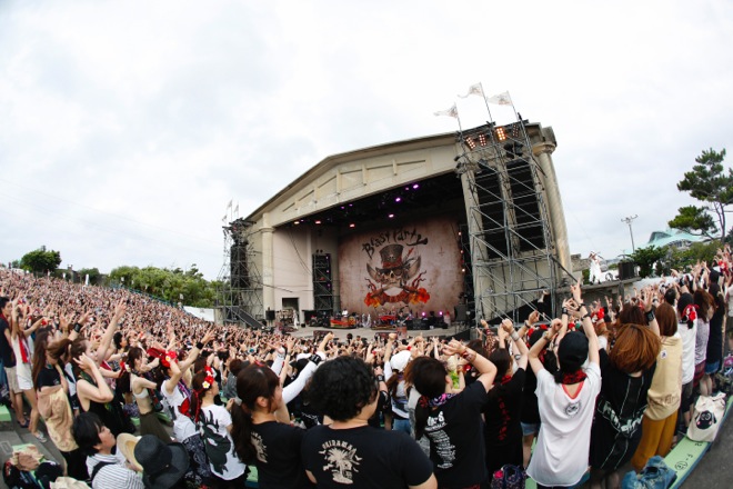 毎年恒例となっているこの夏のイベントも今年で6回目。2012年に<VAMPS LIVE 2012 BEAST ON THE BEACH>として愛知県・蒲郡ラグーナビーチ特設ステージで初開催、翌年には<BEAST PARTY>と名を定め、湖畔(山梨県・山中湖交流プラザ きらら)、里山の丘陵地(新潟県国営越後丘陵公園)、海岸(千葉県・幕張海浜公園内 BEACH STAGE)と、夏のレジャー地を次々と制覇してきた。昨年は関西エリア(大阪・舞洲 太陽の広場 野外特設ステージ)にも初進出。ついに今回、日本の最西端の地、沖縄県へと初上陸した。約4,000人が収容可能な大型屋外劇場であるこの会場は目の前を海に臨む絶好のロケーション。なおVAMPSの沖縄公演は今回が初だ。台風5号の影響で直前まで開催が危ぶまれたが、初日となる8月5日は天候も安定し、無事決行と相成った。