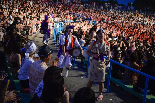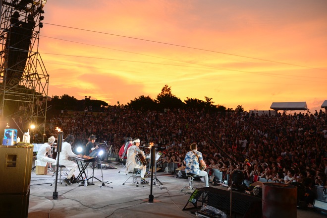中盤、第二部のアコースティックコーナーでは浴衣に着替えたHYDEがひとり、夏川りみの「涙そうそう」をアコースティックギターの弾き語りで歌い上げたのを始めに、メンバー全員参加のMCなども挟みつつ、「MISSION」「MY FIRST LAST」といつものVAMPSライヴとはひと味違った柔らかな音色を響かせる。コーナーの最後は「せっかくなので沖縄らしい曲をもう1曲」とプロの三線奏者を招いてTHE BOOMのカバー「島唄」を演奏。夕焼けで真っ赤に染まった空の下、HYDEの深みのある歌声と三線独特の音階、温かく力強いバンドサウンドが絶妙に融け合ったアンサンブルにその場の全員がうっとりと聴き入った。