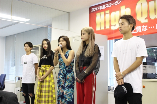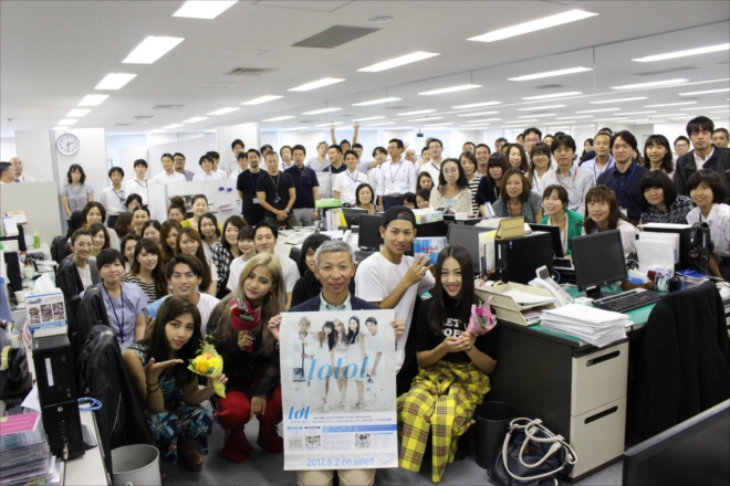 広々としたオフィスにメンバーが登場すると、大勢の社員が仕事の手を休め拍手でお出迎え。日頃大勢の観客を前にパフォーマンスを行っているlolだが、ライヴとは違う緊張感に包まれているようで、社員を前に一列に並んだメンバーは神妙な表情。avexのマネージメント担当者からの挨拶に続き、メンバー1人1人が挨拶を行った。