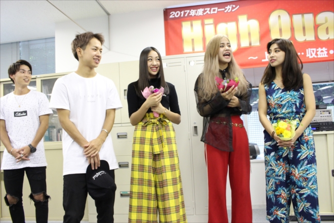 そしてここで、渡邊本部長から思わぬサプライズが。アルバムリリース翌日の8月3日がhibikiの誕生日ということで、hibikiに花束がプレゼントされたのだ。「嬉しい!ありがとうございます!」と感激した様子のhibiki。そして同じく8月生まれのhonoka、さらに2月生まれのmocaにも花束がプレゼントされ、友祐と直人には「力持ちでカッコイイ2人にはこれからも頑張ってもらいたい」ということで、気合を注入すべく(?)エナジードリンクを箱ごと贈呈。メンバー全員、思わぬプレゼントに満面の笑みで喜びを表していた。最後は全員で記念撮影を行うと、メンバーが社員1人1人とハイタッチしながら退出して、万雷の拍手の中、表敬訪問を終えた。