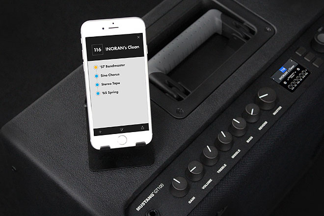 ▲スマホアプリでプリセット管理ができるMUSTANG GTシリーズは、Bluetooth スピーカーとしても使用可能。小型で家庭用の40Wモデル、小規模なライブ用の100Wモデル、中規模から大規模なステージもこなせる200Wの3モデルをラインナップ。