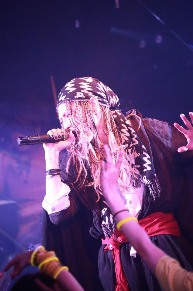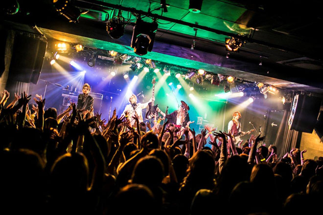 関係者エリアまで解放され、超満員のオーディエンスがCLØWDの登場を今か今かと待ち侘びる中、場内が暗転。海賊に扮した衣装でメンバーが登場すると、フロアからはひと際大きな歓声があがる。そのままライヴが始まると思いきや、持っていたベースをKØU(Vo)に渡し、かわりにマイクを手にした猟平(B)が「飛ばしていくぞ東京!!」と煽ると、猟平ボーカルのまま「ANTITHESE」がスタート。本職がベーシストであることを疑うほどのハイトーンボイスで楽しそうに歌う猟平は「楽しんでいこうぜ!!」とさらにフロアを煽ったが、あの瞬間を一番楽しんでいたのは間違いなく猟平本人のはずだ。