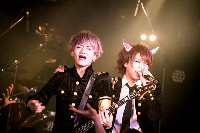 ここからライヴはラストスパートに突入する。「声を聞かせろ!!」と始まった「エルゴ領域」でアクセルを踏み、そのまま「バタフライ・エフェクト」に入ろうとしたところ、イントロでシーケンスにトラブルが発生し音がブツブツと途切れて止まってしまったのだ。ツアー初日にはトラブルがよくあると言うがここまでのトラブルを目にするのは初めてで、オーディエンスも私も驚きを隠せなかったが次の瞬間、袖からケーキを持った“いつも以上に構われ隊”のメンバーが登場することで状況は一変、笑いに変わる。そう、全ては猟平以外のメンバーによって仕組まれたバースデイサプライズだったのである。シーケンスのトラブルもメンバーによって作り込まれたもので、その出来栄えは猟平の「マジで心臓に悪い!!」というリアクションでもおわかりの通りかなり手の込んだイタズラだったようで、猟平を驚かせてお祝いしようとした冬真(G)と庵(G)は無邪気な子供のような顔で種明かしした。