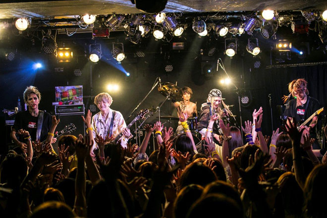 続けて「頭振るの好きだろ?」の煽りで始まったのは、こちらも初披露の新曲「我武者羅」。樹(Dr)の高速バスドラと猟平のスラップで突っ走るファストナンバーで、フロアも負けじとヘッドバンキングで応戦し、この日初めて聴いたとは思えない盛り上がりを見せた。