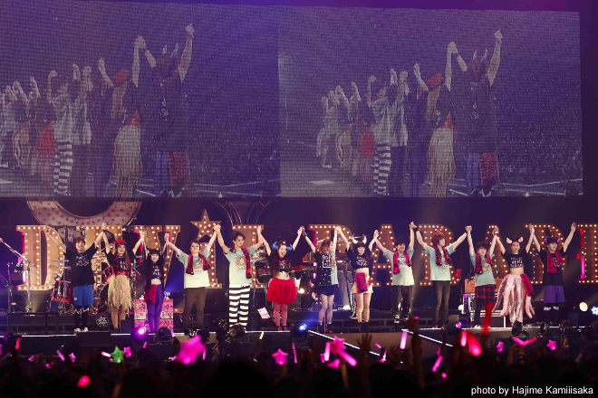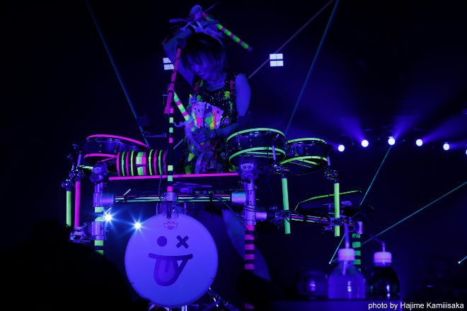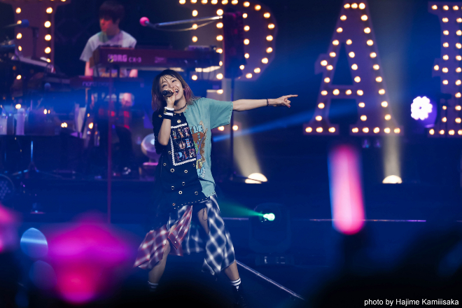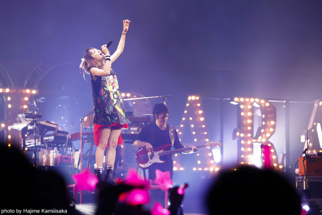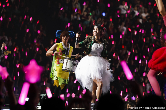 オープニングに続いて、ストーリー性のあるムービーが映し出され、後半へ突入。ダンサー“メガどーナッツ”が扮するたくさんのDEViLたちと一緒にセンターステージで「キモチファクトリー」「そしてパレードは続く」を披露。「Believe in myself」をアコースティックアレンジで聴かせて一度クールダウンさせ、「人は人に出会うたびに傷つけられたり、悲しくなったり、自分に自信がなくなったり、自分の心を隠したくなったり、もう人と関わりたくないな、人に何か言われるのイヤやなって思うことが毎日たくさんあります。だけどそのぶん、人に出会って嬉しくなったり、幸せになったり、頑張ってみようって思ったり、こんな自分をちょっとだけでも好きになれたり、応援されたり。あぁやっぱり人と過ごしてみたいなって。今日はここにいる時間だけでも一緒に自分の心を愛してあげられますように。一緒に歌って!」と、最新アルバムのタイトル曲であり、ツアーのサブタイトルにもなっている「LiTTLE DEViL PARADE」を披露。いくつもの大きなバルーンが会場に投入された「コズミックジェットコースター」をはじめ、「ROCK-mode」「Rising Hope」など終盤もパワフルなロックナンバーで会場に一体感を作り上げた。