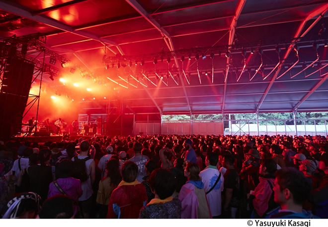 フジロックの会場はエリア間に距離がありながらもこうして感じるものも多く、そうこうしているうちに辿り着いたオレンジ・カフェは、清々しいほどの泥地が広がりながらも(笑)、避難するには最適なフジロック唯一の屋根付きの大型フードコートには案の定溢れんばかりの人々が安らいでいた。昨年から登場したエリアだがさらにスペースが広くなったようだ。そんな景色の先で賑わいを見せていたのが桑田研究会バンドで、彼らは茅ヶ崎市公式行事に毎年招聘される実力派であり、昨年のオレンジ・カフェのパフォーマンスが話題になったサザンのトリビュートバンド。突然聴こえてきたクオリティーの高い「勝手にシンドバッド」の享楽に、つい15分前に聴いていたカントリー・ミュージックとのギャップを存分に味わい、その振り幅はいかにもフジロックらしかった。“トリビュート”という音楽史に脈々と受け継がれるスタイルも体現していた。しかもこの直前の同ステージには、まねだ聖子が、この後には王様が登場していたのだからフジロックは多様で自由だ。