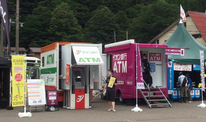 それと改めて言っておきたいのが、まだ参加したことのない人にはフジロックの会場はまるで無人島のようだと想像している人もいるようだけれど、それはない。まず最寄り駅の越後湯沢駅には一式の服装が揃いそうなアウトドアグッズの販売店があり、場外エリアにはもしもの時に安心なATM車、あとは宅急便の受付所もあるし、会場内外のほぼ全ての飲食・グッズの購入に各種電子マネーが使用可能になったほどだ。