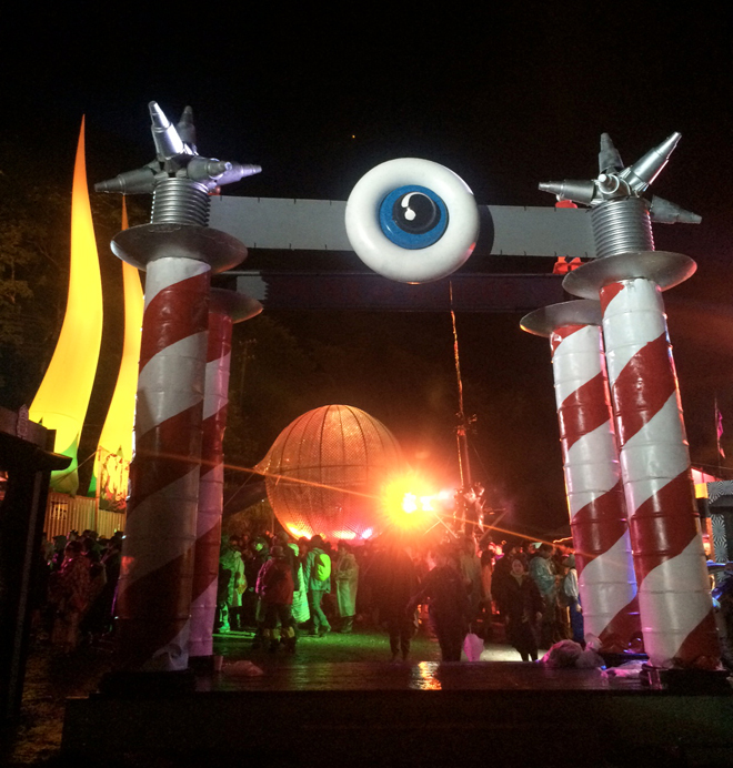 アート/エンターテイメント空間と言えば、場外エリアのパレス・オブ・ワンダーで深夜におこなわれていたフランスのバイクスタント集団“インファーナル・ヴァランズ・メガ・グローブ・オブ・デス”によるスリリングなパフォーマンスにも、人だかりができていた。このエリアは、本当に人を眠らせない(笑)。