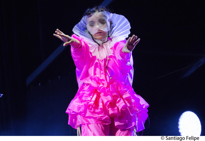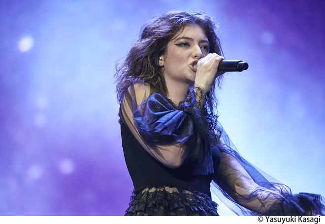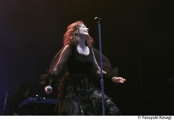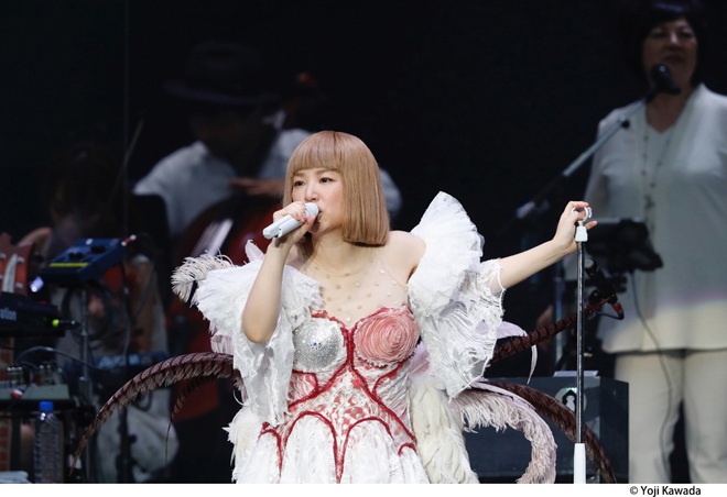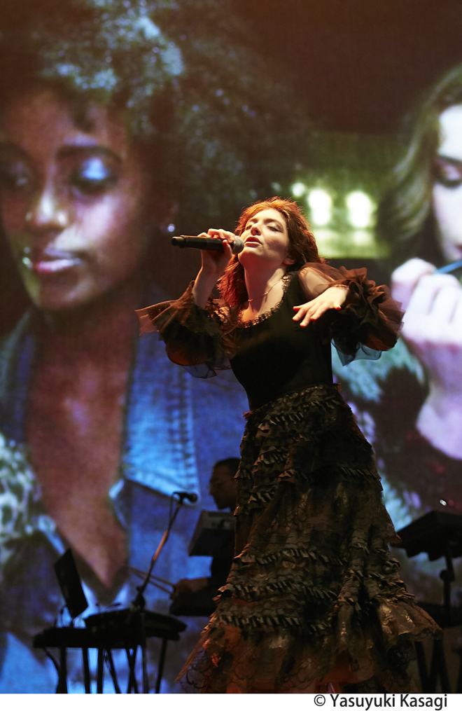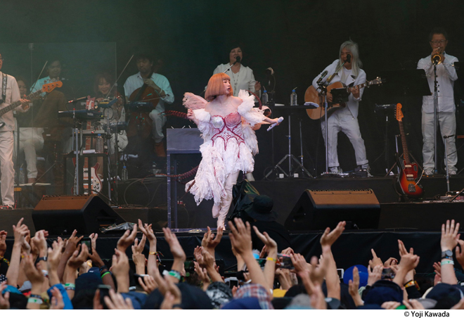 話をアクトに戻したい。タイムテーブルの発表時から話題になっていたものの想像以上のすさまじい体験となったのが、3日目のグリーンステージにおけるYUKI→ロード→ビヨークという流れだった。自己の存在意義を伸びやかに歌う姿が、彼女の音楽人生はいつでも全盛期であることを伝えていたYUKI。バックバンドを従えていたもののステージでは彼女だけがライトアップされ、時に天井を仰ぎ、時にステージの前っぺりに腰掛け、終盤は裸足になって常に動的なステージングを見せながらも、フジロック出演の喜びをMCでチャーミングに語り倒していたロード(ライブ後のTweetもとてもキュンときた)。今回も見たことのない生物のような装いで出現して、オーケストラ&アルカと共に表現した壮大な音楽がまたもや苗場を宇宙にし、最早安定のステージを繰り出したビヨーク(ロードからの転換中のBGMが日本の民謡というのも面白かった)。巨大なステージを掌握するそのたくましい歌姫たちの姿は怖いほど美しかった。ちなみにこの日の夕方にカフェ・ド・パリに登場した戸川純 with Vampilliaのライブも凄まじい熱気だったとTwitterで目にして悔しかった。