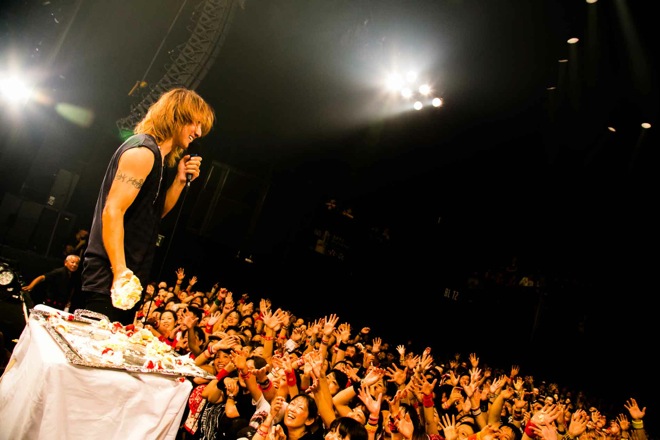 「じゃあ、恒例の豆撒き(ケーキ撒き)を」とJが嬉しそうに笑うと再び、フロアから「火がついてる!」とツッコミが入り、「火のまま行こうかと思ったんだけど、ダメ?」とロウソクの火を吹き消し、早くケーキを投げたそうなJに今度は「ロウソクがついてる」という指摘が(笑)。「ロウソク抜くの? そうなんだ。そんなに火が好きじゃねーんだ?(笑)」と場内爆笑。「食べて」というリクエストにも応え、万全の体制が整ったところで、今年もJ手づかみによるケーキぶちまけ大会が派手に行われ、予告どおりケーキの雨が前方に降り注いだ。