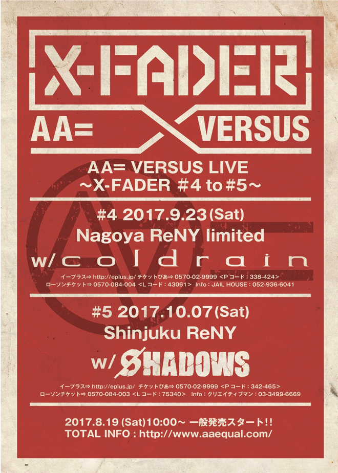 9月23日(土)の名古屋ReNY limited(愛知県)にて開催される<AA= VERSUS LIVE 〜X-FADER #4〜>には、最新アルバム『#5』に収録されている「FREE THE MONSTER」でコラボレーションをしたMasatoが率いるcoldrainが決定した。そして10月7日(土)に新宿ReNY(東京都)にて開催される<AA= VERSUS LIVE 〜X-FADER #5〜>には、2016年に解散したFACTの