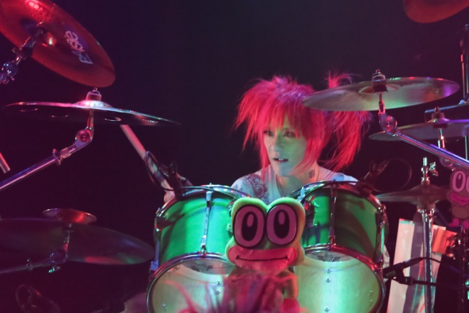 そして、ここから始まるのはドラムソロだ。ステージの一際高い位置にセッティングされたバンドの象徴ともいえる緑の2バスドラムセットから繰り広げられるソロは、プレイはもちろんMCも26年前のドラムソロを再現したもの。その途中では、スティックや衣装、はたまたリズムマシンまで客席に放り込むなどサービス精神もはんぱない。“人を楽しませることが最優先”という彼らならではの“イズム”がこのあたりにも溢れていた。