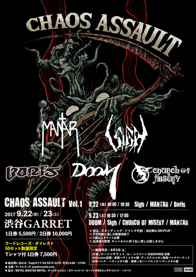 9月22日(金)23日(土)渋谷GARRETで行われるエクストリーム・メタル界のバトル・ロワイヤル<CHAOS ASSAULT Vol.1>には、DOOMのほか、Boris、CHURCH OF MISERY、Sigh、MANTARが集結するフェスも開催される。