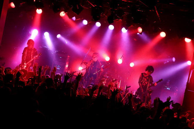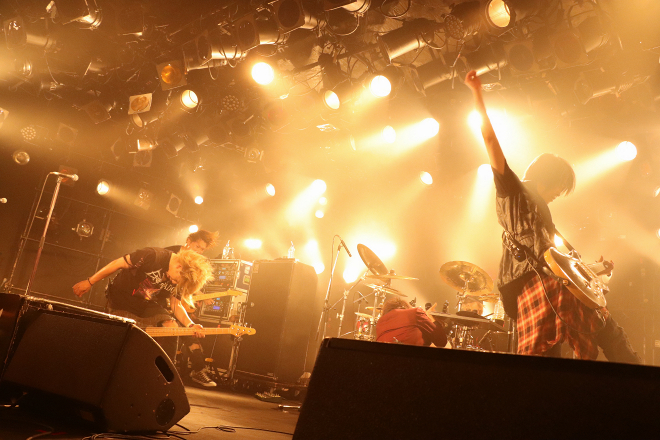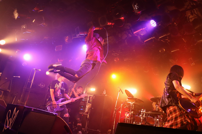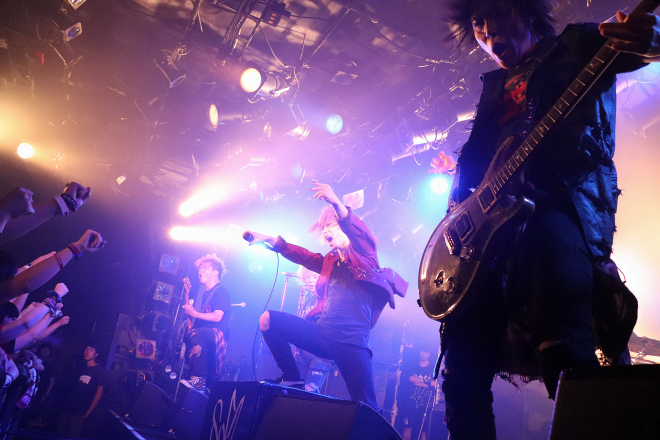 イベントのトリを飾ったのはSuG。SE「MARK」のハンドクラップだけで、すでにファンの一体感がとんでもない熱量を放出。そんななか、この日は「MISSING」でライブの口火を切った。yujiとmasato(G)、ステージ両サイドがアグレッシブにオーディエンスに挑みかけ、その真ん中で武瑠は目を見開いて“狂おしいほど愛してる stay with me forever”と歌う。このパンチラインが、いまは痛いほど胸をつき刺していく。ハートが上げる悲鳴に重なるように、曲の後半、shinpei(Dr)のバスドラが高速でドコドコ鳴り響く。オーディエンスはそんな感傷的な気持ちを振り払って、いま目の前にいるSuGを見逃さずに楽しもうと頭をふり、ジャンプを繰り返し、必死でハンドクラップや熱いoiコールを送り続ける。この日のSuGとファンは、余計なものは全て遮断してお互いしか目に入ってないような形相で、クアトロはいつしか異様な熱狂に包まれていた。