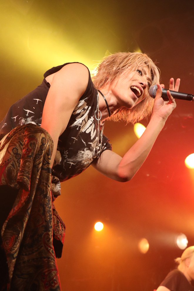 その盛り上がりを引き継いで、2番手はSHINがバンドを従えて登場。ViViD解散後、やっとソロとして本格的に動きだしたばかりなので、彼のライブはまだまだプレミアム。多くのファンが期待を寄せるなか、袖を切り落としたブラックTシャツ。腰にはシャツを巻きつけ、ボトムは黒いダメージデニムとバンド時代とは変わり、ワイルド&ラフなファッションできめたSHINが登場すると大きなどよめきが起こった。「SuGフェス! 上げていこうぜー」とフロアに向かって叫び、勢いよく「4444」でライブはスタート。英詞をのせた「paradox」、「why not?」など 曲はハードなロックナンバーがメインになっている。SHINは前傾姿勢でハンドマイクを構え、バンド時代には見せたことがないような歌い方で、激しいサウンドに負けない迫力あるボーカルを披露していく。