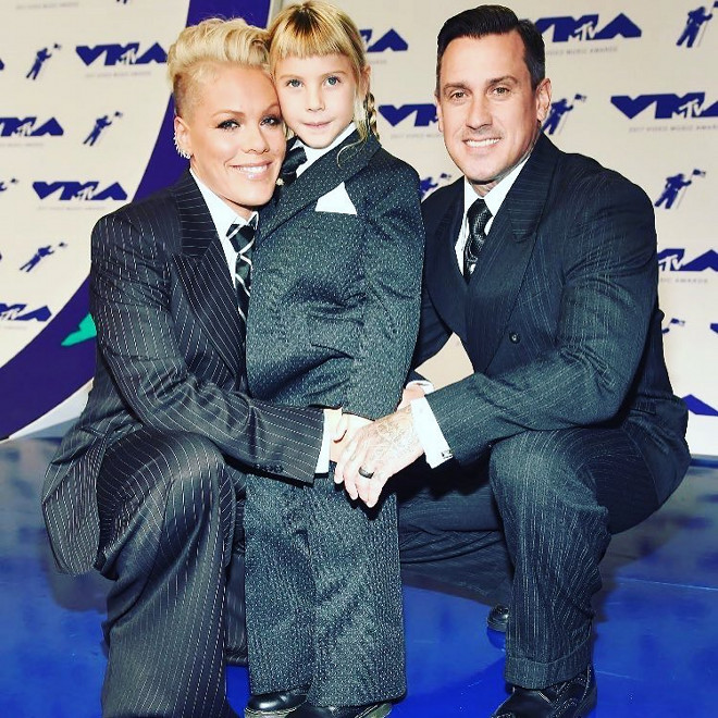 ピンクはこの日、夫ケアリー・ハート(モトクロスレーサー)とウィローちゃんと共に授賞式に出席。3人ともスーツ姿でレッドカーペットを歩いた。