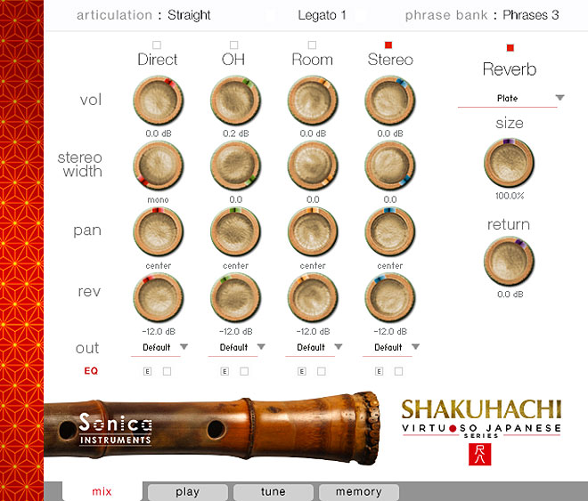 5種類のフレーズバンクには尺八の特徴的なフレーズを収録。また、収録はマルチマイクで行われており、Direct、Overhead、Room、Stereo Mixを個別に専用Mixerでミキシングして音作りができるのもポイント。24bit/96kHzで録音された生々しく力強いサウンド(製品は24bit/44.1kHzで収録)を存分に味わうことができる。