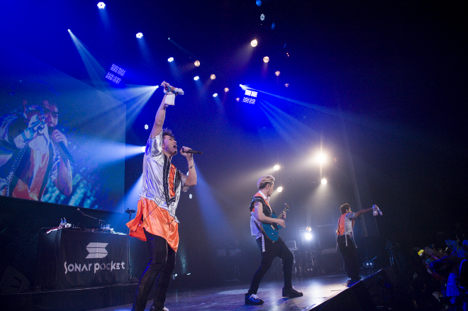 続いて「ライブ10分前に何が“やみつき”なのか疑問に思った。でも、みなさん超特急に、今日のゲストさんにやみつきでしょう?」とリーダーのリョウガが煽り、カイが「そして今日を通してお互いのアーティストにやみつきになる」と落としたところで呼び込まれたのは、もちろん本日のゲスト・Sonar Pocketだ。ko-dai&eyeronの2ボーカルにトラックメイカーでありDJを務めるmattyを擁する3人組は、早くも『超フェス』Tシャツを纏って気合十分。しかも現在、ワンマンツアー『Sonar Pocket JAPAN TOUR 2017 ~Reload~』の真っ最中で、そんななか駆けつけてくれた彼らとは楽屋でのゲーム談義にも花が咲いたと、ユーキも嬉しそうに報告する。