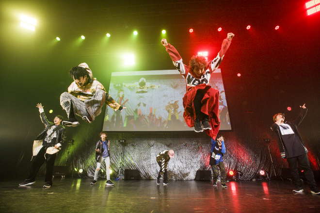 モニター下の幕がロールアップし、ストリートなファッションに身を包んで前に進み出た超特急が最初に放ったのは「SURVIVOR」。ステージの左右に陣取ったコーイチとタカシがタイトな歌声を響かせる中、アクロバティックに魅せるユーキを筆頭にダンサー5人がメリハリの利いた動きで力強く踊って、史上初のメインダンサー&バックボーカルという超特急の個性を頭から印象づける。