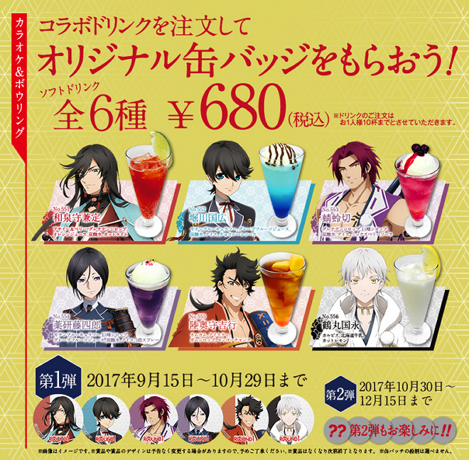 刀剣男士をイメージしたしたコラボドリンクが登場。メニューは全6種(すべてソフトドリンク)。カラオケ/ボウリングで乾いたのどを潤そう。