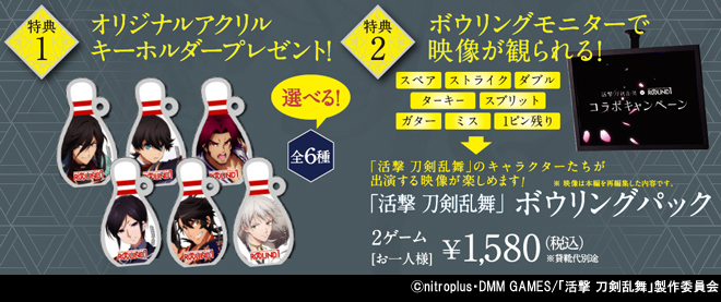 ボウリング2ゲーム+アクリルキーホルダーがもれなくもらえるボウリングパック=「活撃ボウリングパック」。ボウリングのピンを型どったアクリルキーホルダーは、『活撃 刀剣乱舞』で活躍する刀剣男士、和泉守兼定・陸奥守吉行・堀川国広・薬研藤四郎・蜻蛉切・鶴丸国永の六振りをデザインした全6種から好きなものが選べる。