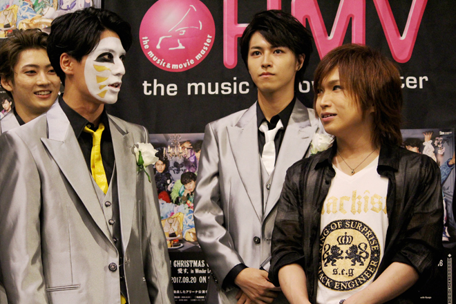 公演前には囲み取材が行われたが、なんと超特急のリョウガ(3号車)とユースケ(6号車)は、ゴールデンボンバーの樽美酒研二(Doramu)風の白塗りメイクで登場。リョウガはその顔のまま、本日のライブについて「ふざけず真面目にやっていきたい」と宣言しメンバーから総ツッコミを受け、ユーキ(5号車)は「全力でつぶしにいきます。ゴールデンボンバー待ってろよ!」とゴールデンボンバーを煽った。