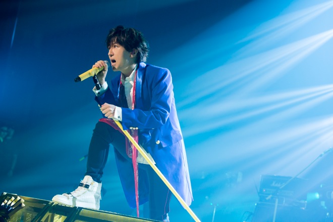 バック陣によるインストゥルメンタルに続いて演奏された「Can’t stop believing」からライヴは後半へ。グラムロックの匂いとキャッチーなサビを融合させた「愛されんだぁ I Surrender」やR&Rテイストを活かしたサウンドでアッパーに進みつつ、「Roulette」では曲中に恒例の“サイコロトーク”を挿入。ちなみに今回はドラムの山崎 慶が「情けない話」というお題で、間違って女性専用車両に乗ってしまったという話を披露する場面も。本編ラストはブルースブラザース風のダンサー2人が登場して、ステージの熱気に拍車をかける「Are you ready to ride?」で締め括られた。