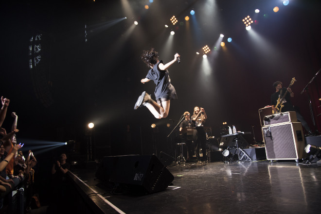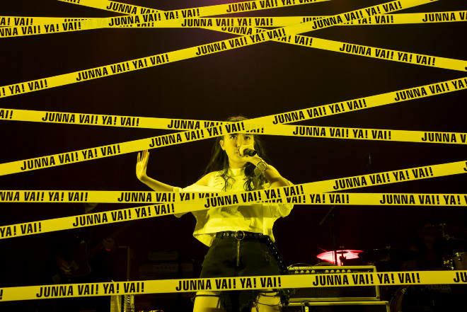 一転、衣装をチェンジしたJUNNAと共にステージに現れたのは、『Vai! Ya! Vai!』のジャケットさながらのテープが張り巡らされたセットだ。表題曲「Vai! Ya! Vai!」に続き、「Catch Me」ではJUNNAがお立ち台からタオルを振り上げて会場を盛り上げ、「僕らの戦場」「破滅の純情」とアップナンバーの連続に観客の熱気も最高潮に達する。