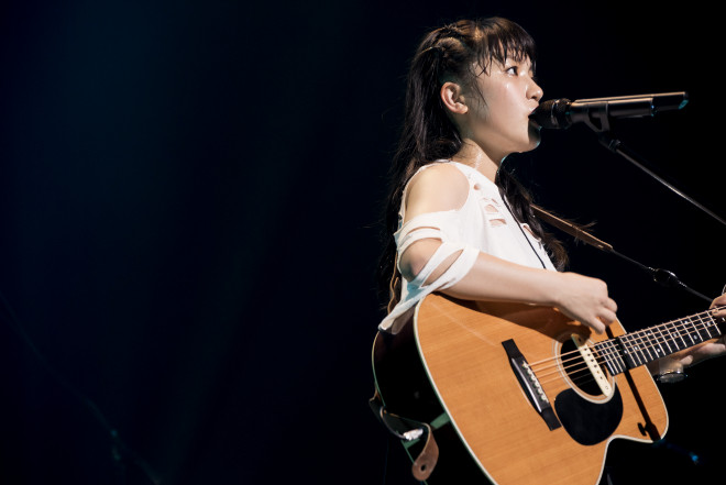 地元・名古屋での最終公演は、エレキギターを携えての「大人は判ってくれない」からスタート。「JINXXX」では力強い歌声とセクシーなダンスで大人びた表情を見せ、ワルキューレの「LOVE! THUNDER GLOW」や『Vai! Ya! Vai!』からの「火遊び」、アコースティック編成による坂本真綾「ダニエル」のカバーに続いては、「この一年、たくさんの出会いがありました。全ての出会いに感謝の気持ちを込めて、歌います」と『マクロスF』からの楽曲「ダイアモンド クレバス」を歌い上げた。