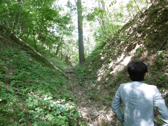 城の麓に館の跡があると書いたが本来はここを住居にして、いざ戦となると城まで登っていたとされる。城の麓にある清長寺から三の郭に届く道が残っている。これが本来の城への道となっているがこれを本気で登るとなると見学に半日かかってしまう。現在は城の大手とされる入り口付近まで車で登れるようになっている。その見学は城マニアとして邪道だが体力に自信がない方にはお勧めしない。と言っても我々もロケする時に車で上まで来ちまったけどな。そしてこの入り口に当時はこんなだったと思います的な模擬の城門が復元されている。模擬の城門が復元?なんか言い方おかしくないか?と思うのだがスルーして行こう。この放送の後にいろんな人から