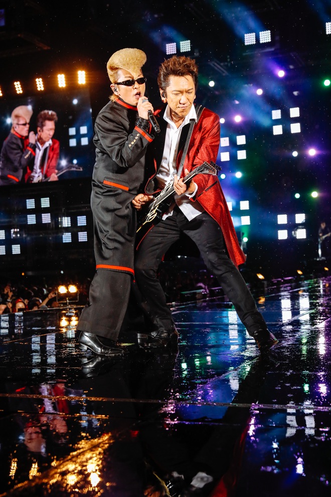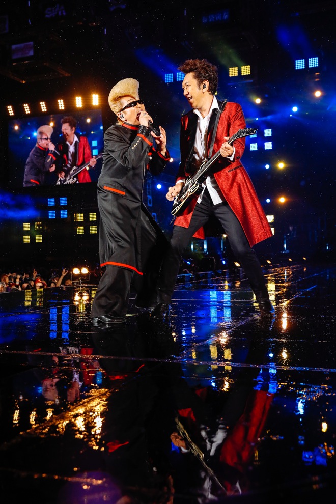 恐らく、その翔ヤンのリクエストなんだろう。共演するナンバーはBOOWYの「Dreamin’」。お互いに夢を叶えたこのステージにもふさわしいナンバーだ。布袋がすぐ横で弾くギターに感動しつつ、翔ヤンが歌い、サビでは向い合って歌う2人。ギターソロでは、まずは翔ヤンがセンターステージに向かいながらファンを煽り、エネルギーの渦の中心で布袋が弾きまくる。最高の場面の連続だ。
