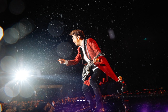 しかし、次からはそれじゃ収まらなかった。事前に、「みんなが聴きたがっているであろう曲は是非やりたい」とも語っていた布袋。SEとしても流していた「THRILL」の生演奏である。ブレイクで布袋が耳を手に当たれば、会場からはでっかいコーラスが張り上がった。さらに「POISON」、そしてなんとBOOWYの「Bad feeling」までも。布袋が手にするのは、おなじみの格子柄のテレキャスタイプ。キレのあるカッティングはもちろん、ギターソロは雨がジャンジャン降る中、センターステージでキメた。