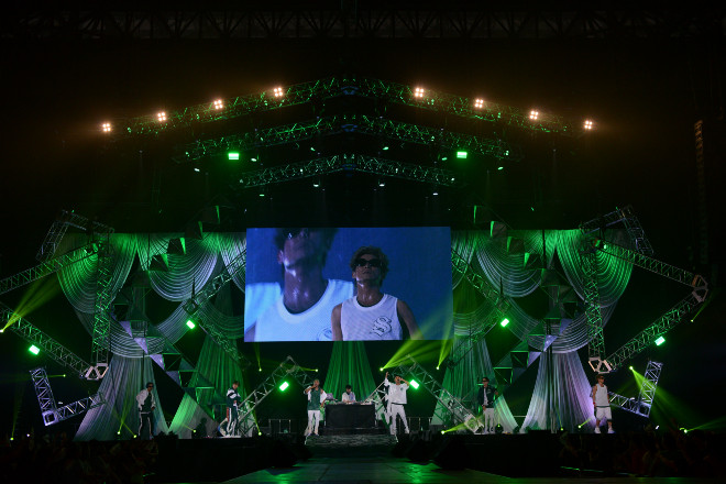 ステージにシートが敷かれはじめ、会場がざわめく中、3組目に登場したのはゴールデンボンバーだ。“号泣バンド”の異名を持つBLUE ENCOUNTにちなんだ喜矢武豊のギターソロパフォーマンスや、時事ネタを取り入れた扮装でステージ周りを練り歩く樽美酒研二の姿に会場は大爆笑。「ICE BOX」「女々しくて」などのパフォーマンスでオーディエンスを沸かせ、最後は「次はEXILE THE SECONDさんです! イベント最後まで楽しんでいってください! ……スタッフさん掃除お願いします!」と鬼龍院翔の呼びかけでEXILE THE SECONDにバトンを渡した。