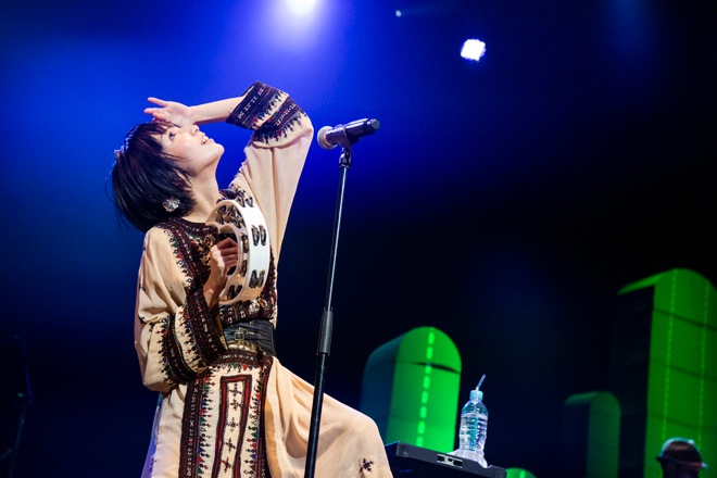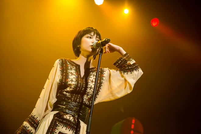 そう言って観客に笑顔を見せた植田は、この<UTAUTAU>のコンセプトを語りながら、「今日は、歌のパワーの強い曲を選んで持ってきました」と続ける。中盤の曲たちは、よりディープに心の奥へと入り込んでかき回し、甘美な狂気を生み出す曲が続く。最新シングル「REVOLVER」のカップリング曲であり、収録時は“demo“としたアンビエントなサウンドだった「最果てへ」は、植田真梨恵がアコースティックギターを弾き語り、ドラム、ベース、鍵盤が、ささやくように言葉を置いていく歌を、繊細に縁どる美しい1曲へと姿を変えた。荒野の旅は「最果てへ」をすぎて、静かな夜を迎えていた。
