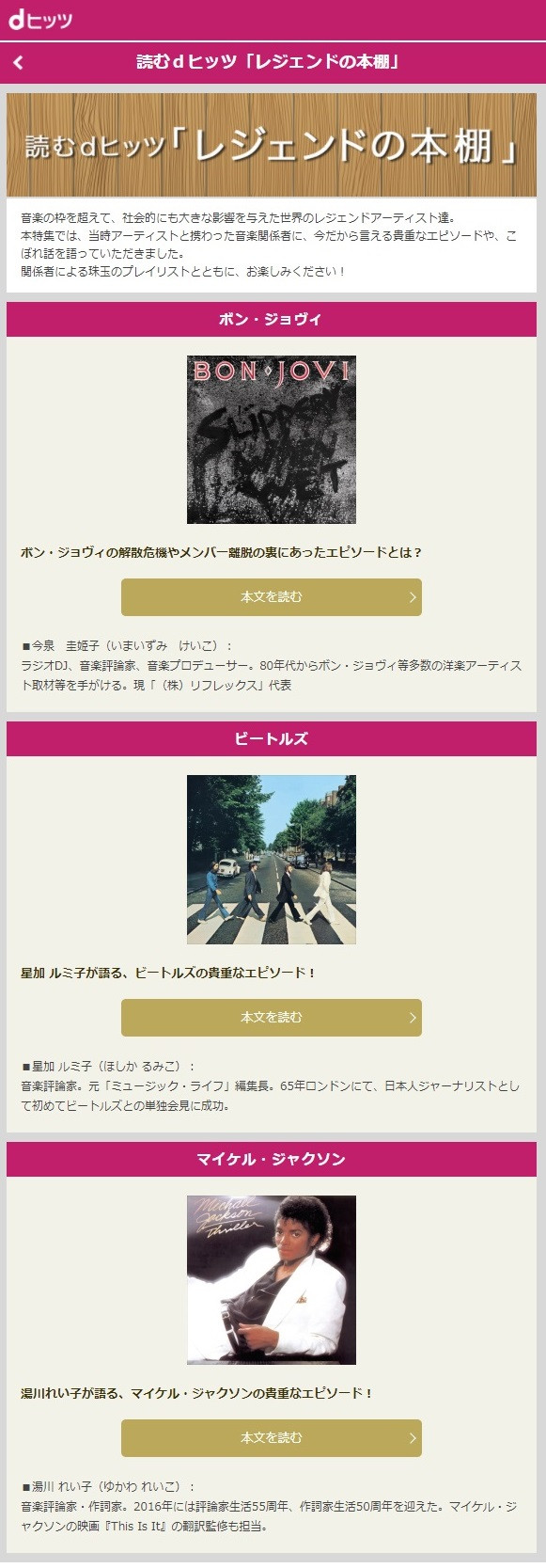 マイケル、ボン・ジョヴィ、ビートルズら、「dヒッツ」連続企画で貴重エピソード続々