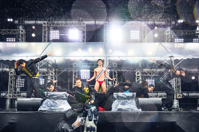 メンバー全員がリーゼントに刺繍入りの学ランで乗り込んできた総勢10人は、初っ端から「喧嘩上等50%」のカバーでお客さんのハートを鷲掴みにした。続く2曲目も「One Night Carnival」カバー。だが、その曲の途中で“ハイパーイリュージョンショー”と称したマジックを見せるなど独自のやり方で攻める。両手に手錠をかけた辻本達規をボックスに閉じ込めて、そのうえに本田剛文が立つ。ふたりを布で覆うと、ふたりの位置が入れ替わり、なぜか辻本がスクール水着で登場するという本格的なマジックだ。