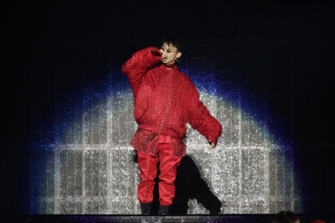オープニングは、一人の人間のヒューマンドラマに焦点をあてた趣向のライブへの導入として、映像で波打っていた心臓の音が停止し、“ピー”という音になったところで1stアルバム『Heartbreaker』のリード曲「HEARTBREAKER」が始まるというものだった。G-DRAGONはだだっ広いドームのステージに一人ぼっちで登場。大声援とともに黄色い王冠ライトが揺れるドームに向けて、“さて止まったのはクォン・ジヨン、それともG-DRAGON、どちらの心臓でしょうか?”と冒頭から問いかける。今回はコンサート全編を通じて、巨大LED画面はあるものの、ステージは舞台中央に可動式の四角いステージがあるだけで、それ以外のステージセットはなし。花道もサブステも、トロッコもない。バックバンドはほぼ見えない場所でプレイ。ステージはG-DRAGONとダンサーのみに徹した空間作りが施されている。さらに、徹底したこだわりを感じさせたのは、色の配置だ。マイク、スタンド、イヤモニというG-DRAGON周りの機材、さらにはライブを通して6回着替えた衣装は、ダンサーを含めてすべて本ツアーのコンセプトカラーの“赤”ベースで統一。さらに、使う照明の色まで赤ベースに絞っていた。前回のワールドツアー<2013 G-DRAGON WORLD TOUR [ONE OF A KIND]>が世界標準のあらゆるライブ演出を搭載したゴージャスなものだっただけに、過剰なステージセット、色、光などを一切省いた今回とのギャップはすさまじいことになっていた。