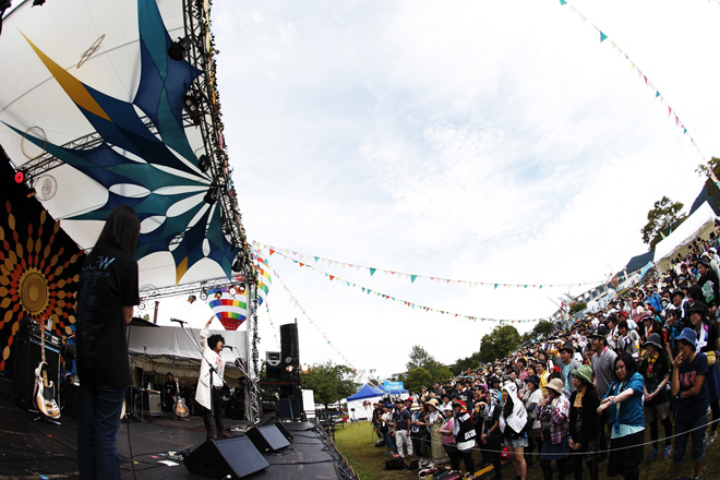 大小7つのステージから太陽光の力によって生み出された、輝くようなサウンドが中津川公園に響き渡る2日間のスタートだ。10時53分、RESPECTステージに佐藤タイジ(シアターブルック)と青山中津川市長が登壇、秋晴れの広がる空のもとで開会宣言が行われた。1969年に行われた<全日本フォークジャンボリー>が開催されたのもここ中津川であり、偉大なる日本フェスの魁へのリスペクトの思いを込め、RESPECTステージで開会式を行うことにしたという。