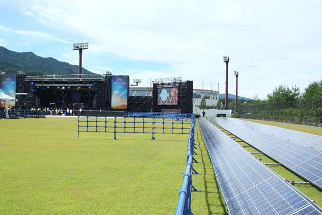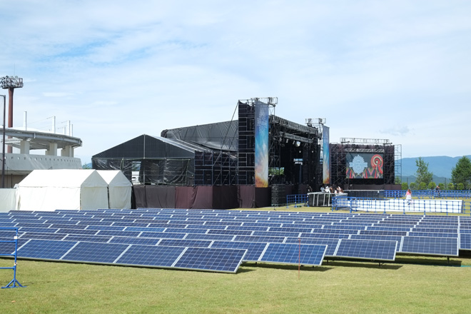 様々なロックフェスが日本国内で開催されている状況下、<中津川 THE SOLAR BUDOKAN 2017>は、開催初回から第6回目を迎えた今年度に至るまで、一貫して音響照明に関わる全ての電源をソーラー発電でまかなっている。フードコートの全メニューには放射線量を表示するという、強いメッセージ性も有している。